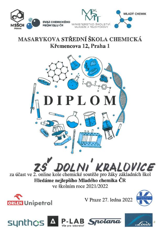 Ve čtvrtek 26. 1. 2022 na naší škole proběhlo online celorepublikové kolo soutěže Hledáme mladého chemika 2021/22. Tohoto kola se zúčastnily dvě žákyně 9. třídy – Lara Althea Šmídmajerová a Lucie Pastorková. V celkové konkurenci 1500 soutěžících z celé republiky si nevedly vůbec špatně. Tímto gratulujeme a přejeme mnoho úspěchů v dalších soutěžích, kterých se i v současné náročné době naše škola účastní.